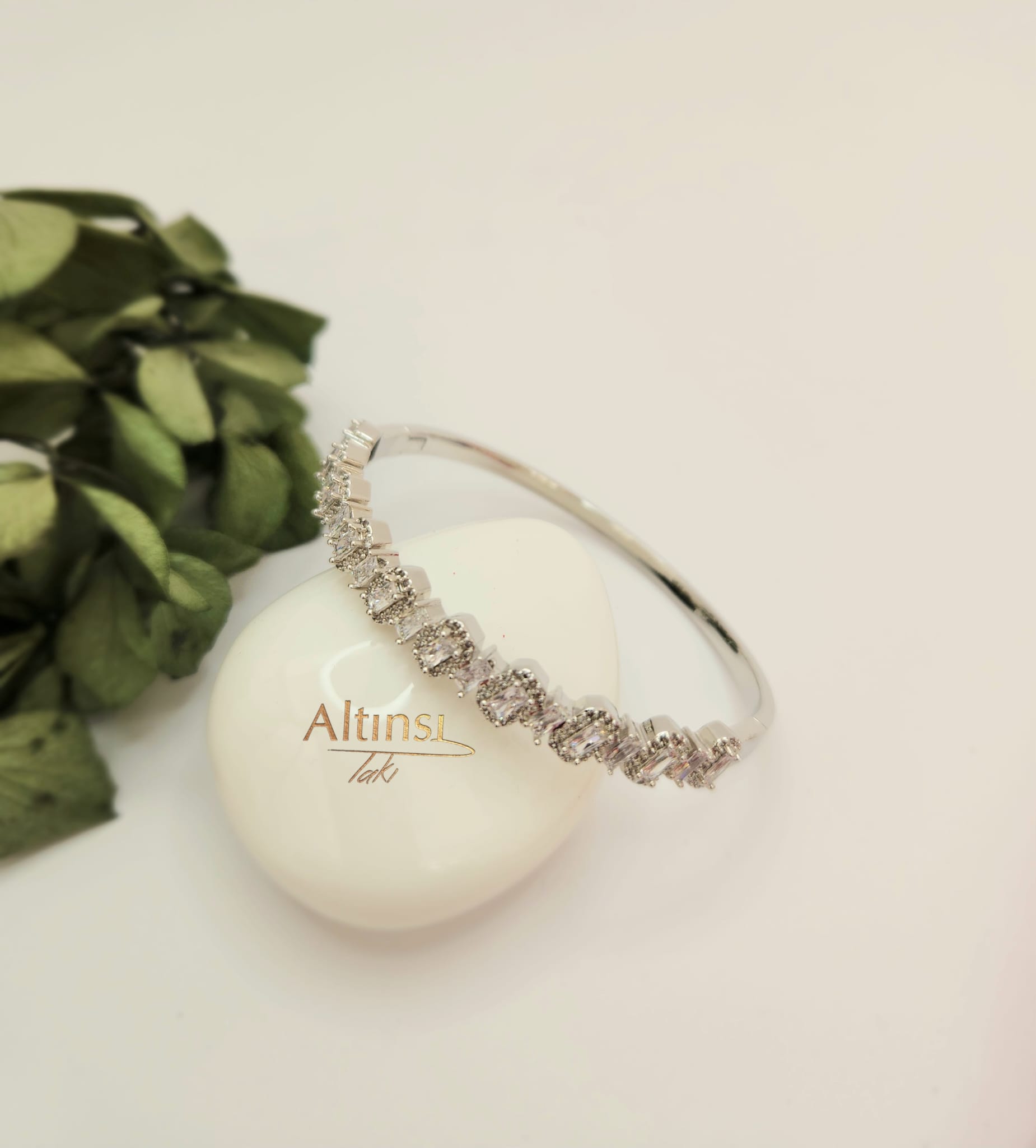 - BEYAZ ALTIN RENGİNDE RODYUM KAPLAMA TAŞLI KELEPÇE BİLEZİK