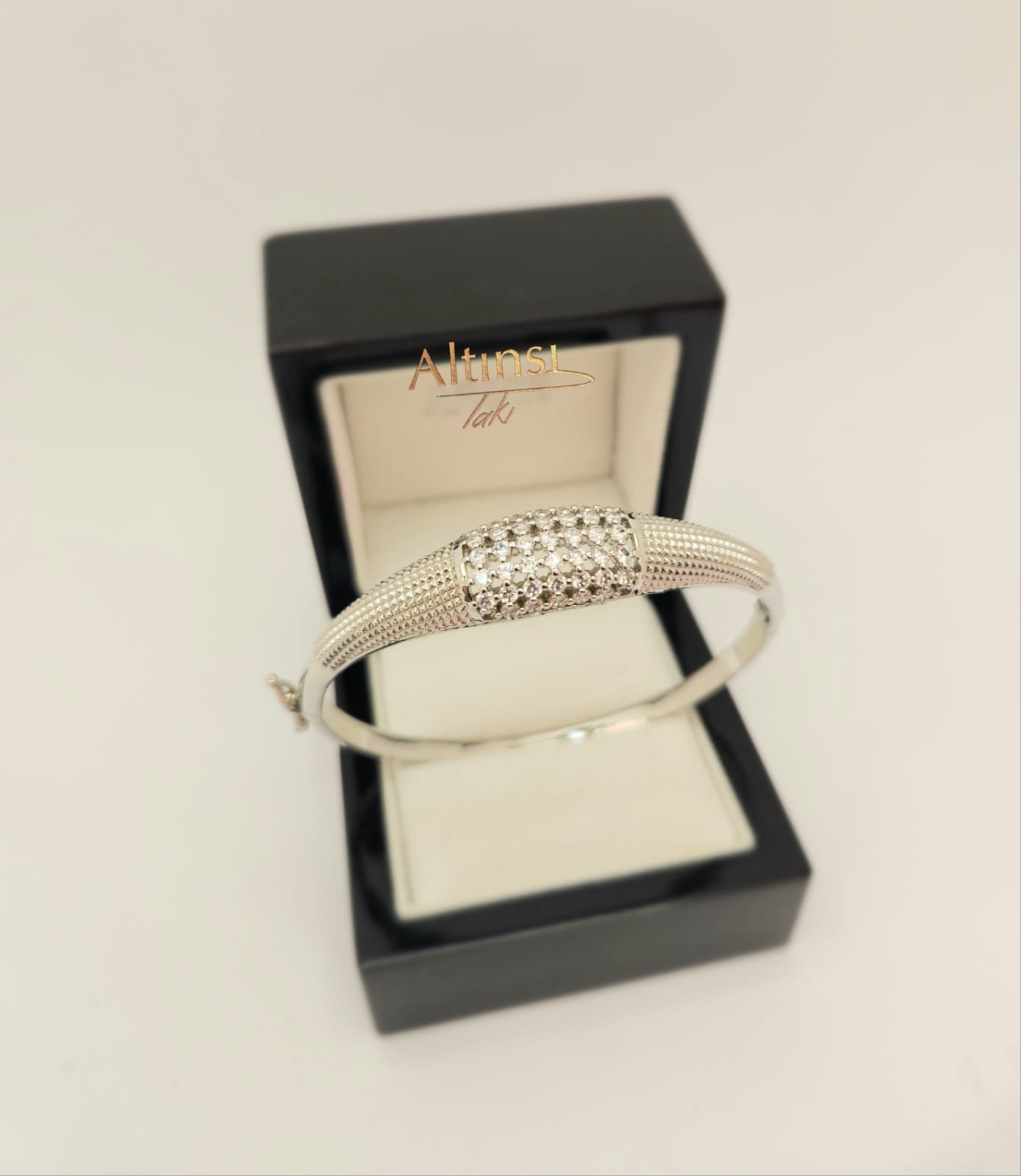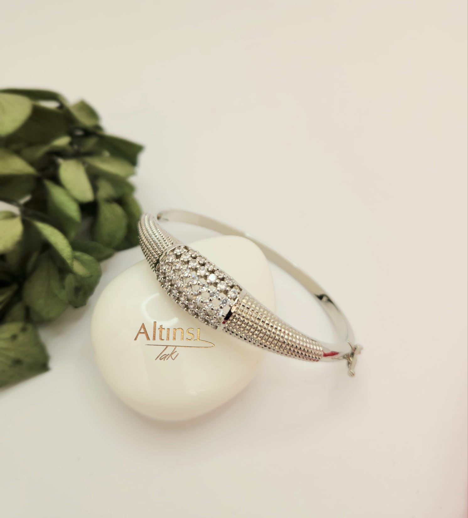- BEYAZ ALTIN RENGİNDE RODYUM KAPLAMA TAŞLI KELEPÇE BİLEZİK