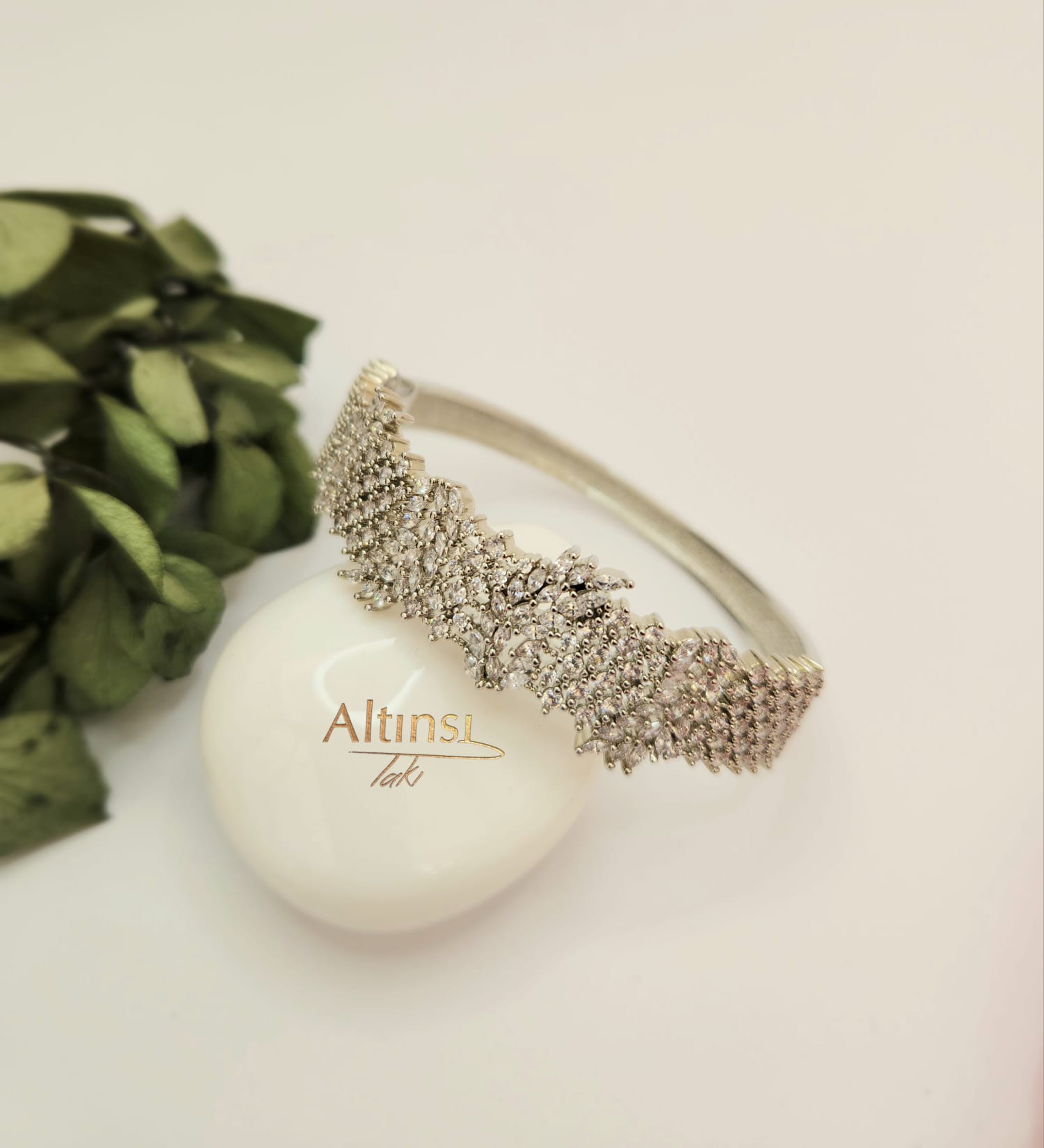 - BEYAZ ALTIN RENGİNDE RODYUM KAPLAMA TAŞLI KELEPÇE BİLEZİK